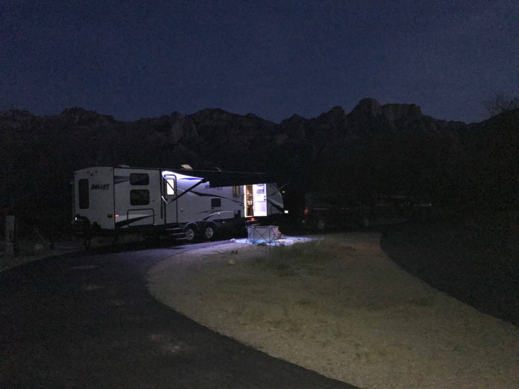 We pulled in to our campsite well after dark. We found our spot and parked in a manner that would require us to re-park the next day. Everyone stayed in the van while I set up. Until I got to the slides, which did not open. The rewire “fix” at the RV shop jacked up my slides. As I searched furiously for the manual slide opening bits, cussed, sweat, and almost cried (not really) I decided to try hooking up the power to the van… the shore power was already hooked up and didn’t work. Again, by God’s grace, it worked.