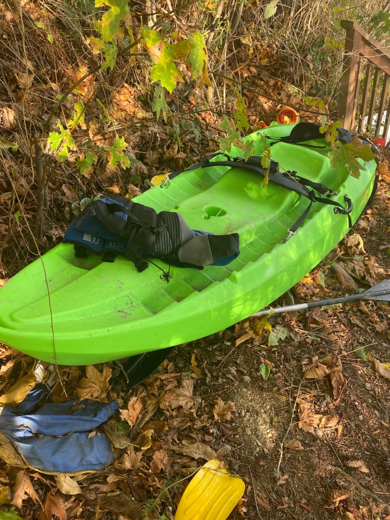Now, a couple weeks ago our neighbor yelled over the fence while I was cleaning out garden boxes “you should go check your kayaks, I saw some in the beach.” That’s bad. Last time we used them we secured them. Two three person kayaks and two small kid single kayaks, on a large log that came to rest on the high bank on our beach. If they were on the beach (not on the log) that meant something happened… high tide? Thief’s? I went straight down and discovered half were missing. A big green three person and a little yellow kid kayak. Gone.