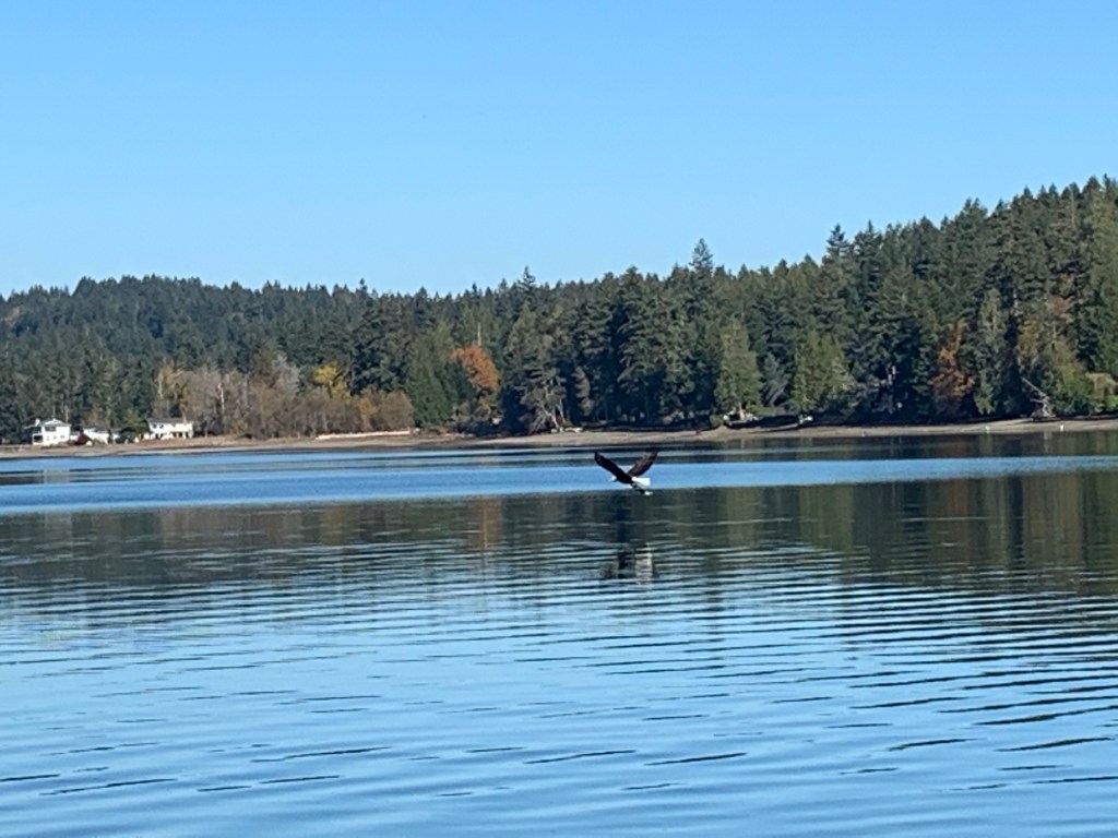 Hard to believe we were out in kayaks on November 1st wearing shorts and tshirts. As we approached our beach we saw a scuffle between an eagle and an otter a couple houses to the south of us. The otter eventually fled, and the reason for the fracas became apparent when the eagle rose from the beach with a good sized flounder in its talons. I told Tara eagles can see prey for a mile… when I looked it I’m up later I learned it is actually two miles… with accuracy. They’re amazing. The eagle flew north and landed to enjoy its feast on a log in front of our neighbors to the north.