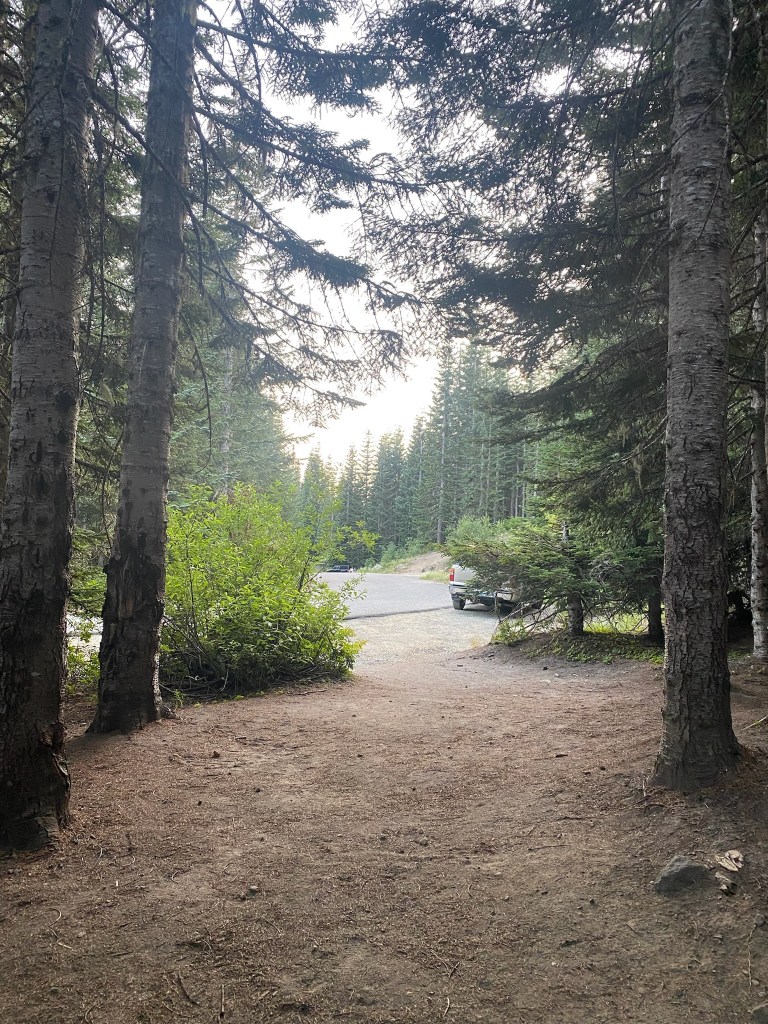 As the road wound around Alpine lakes, and through quaint Cougar, Washington, we had plenty of time to contemplate the next days hike/ climb. We ended our drive at the Climbers Bivouac campground in Gifford Pinchot National Forest. Climbers Bivouac consists of several first come first served sites, which were fortunately all open when we arrived around three. We picked what we thought would be a large secluded site in the back corner and set up camp. After setting up our big old REI half-dome tent, we tried to enjoy our now lukewarm pizza next to the currently prohibited fire ring.