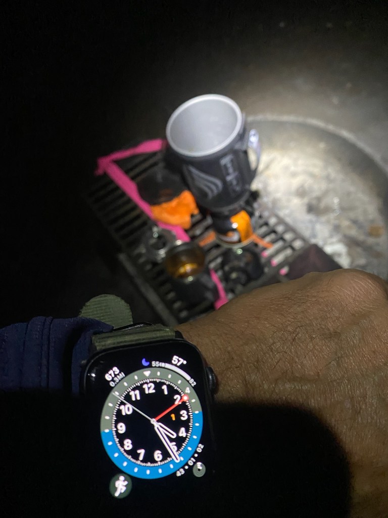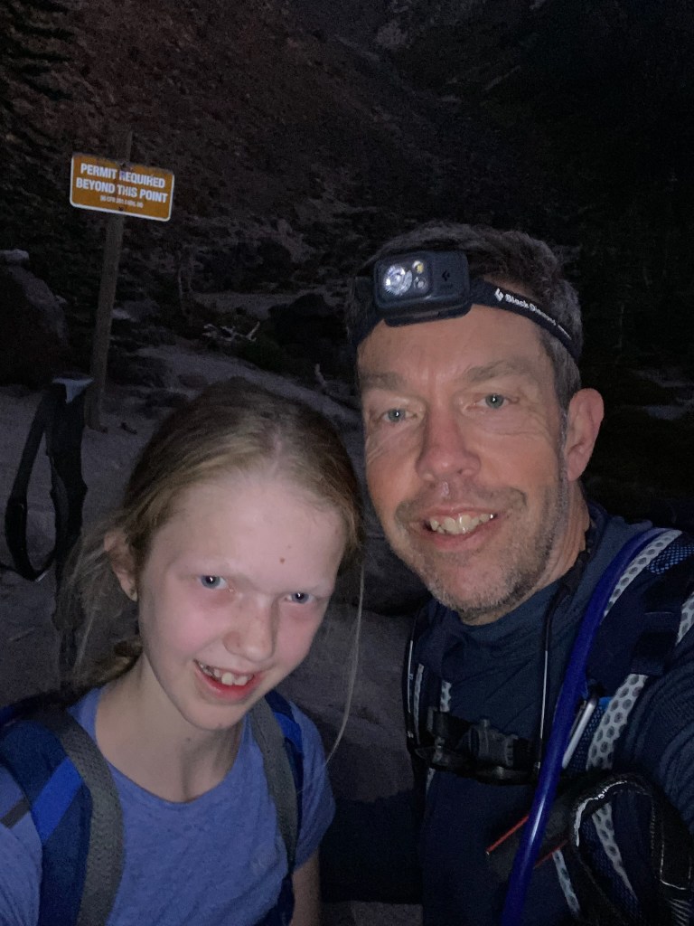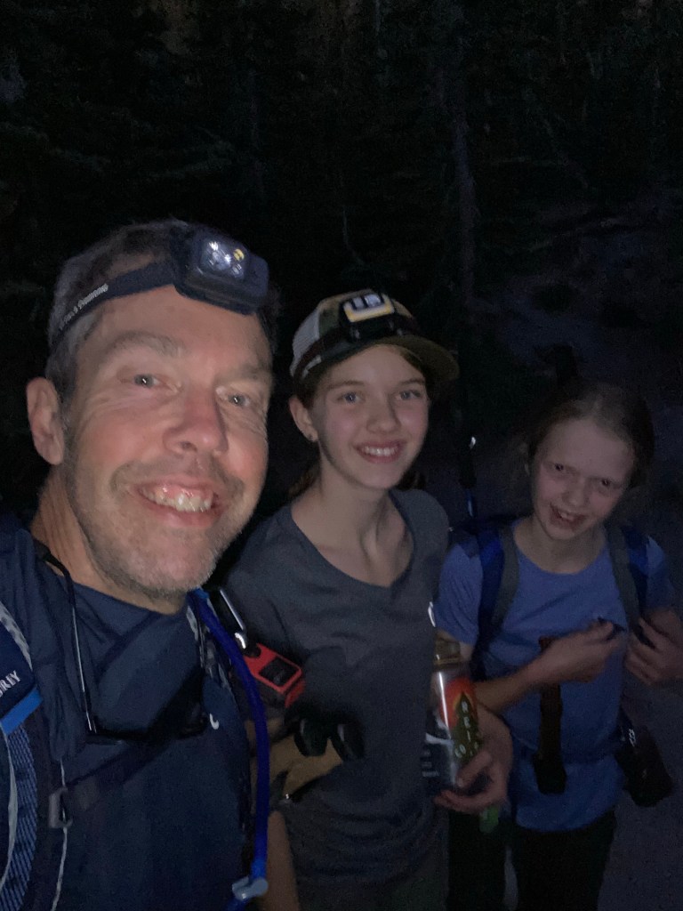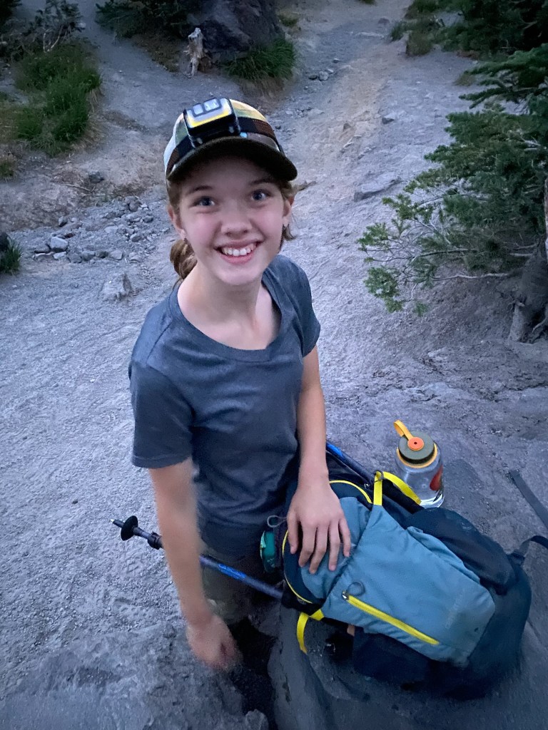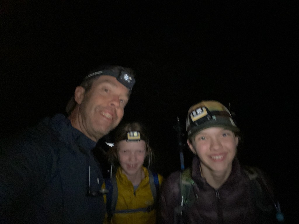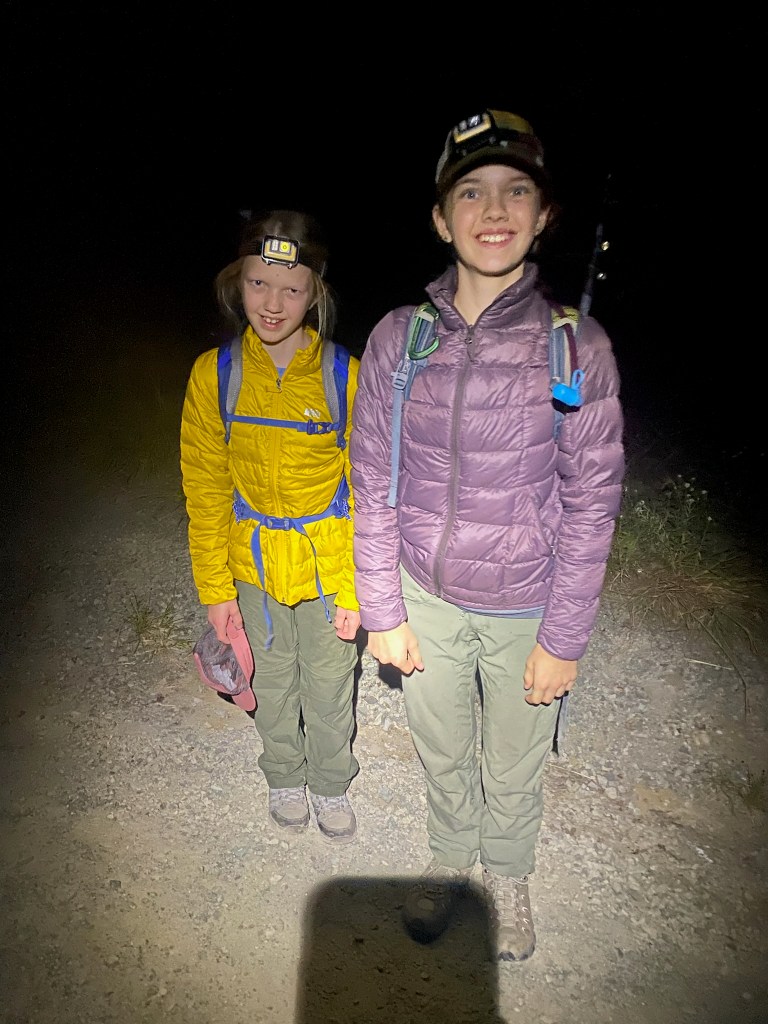 With no cell service, I messaged Tara we would be heading to bed soon from our Garmin InReach mini. The evening cooled off quickly, and we set the alarm for 0400. We all fell asleep pretty quickly, but slept lightly until we were awakened at 1am by an arriving group of hikers who intended to eat breakfast on the summit and watch the sunrise. Their loud voices woke the campground, and their prep, which seemed to last forever before they finally departed, made sleep seem unlikely. Sleep came however, and was abruptly ended by a too early alarm at 0400. I momentarily contemplated going back to sleep due to the middle of the night wake up, but got out of my cot anyways, and turned on the camp light. The girls got right up, eager with anticipation. After getting dressed, and making coffee on the jetboil, we were on our way.