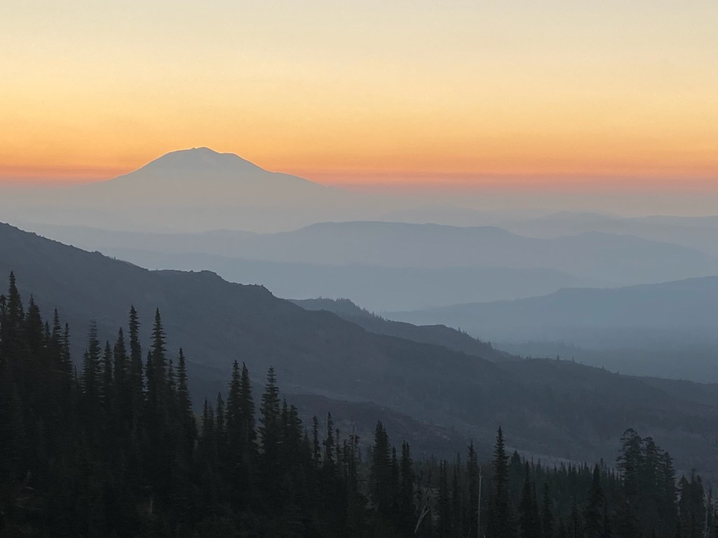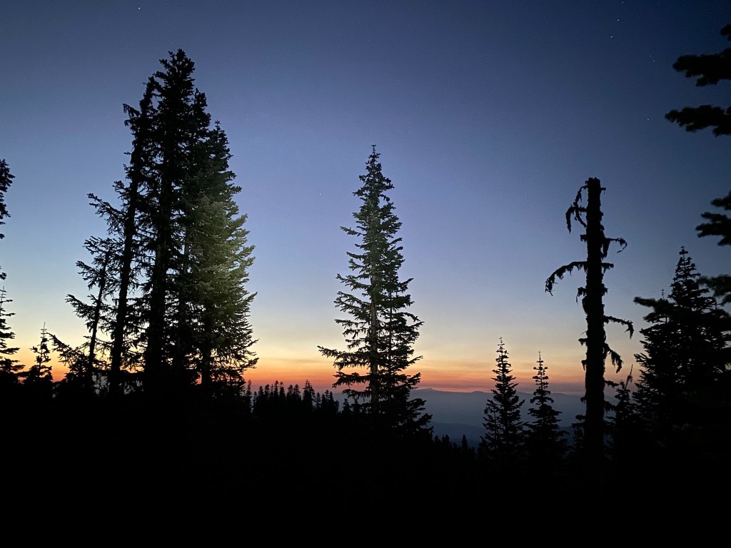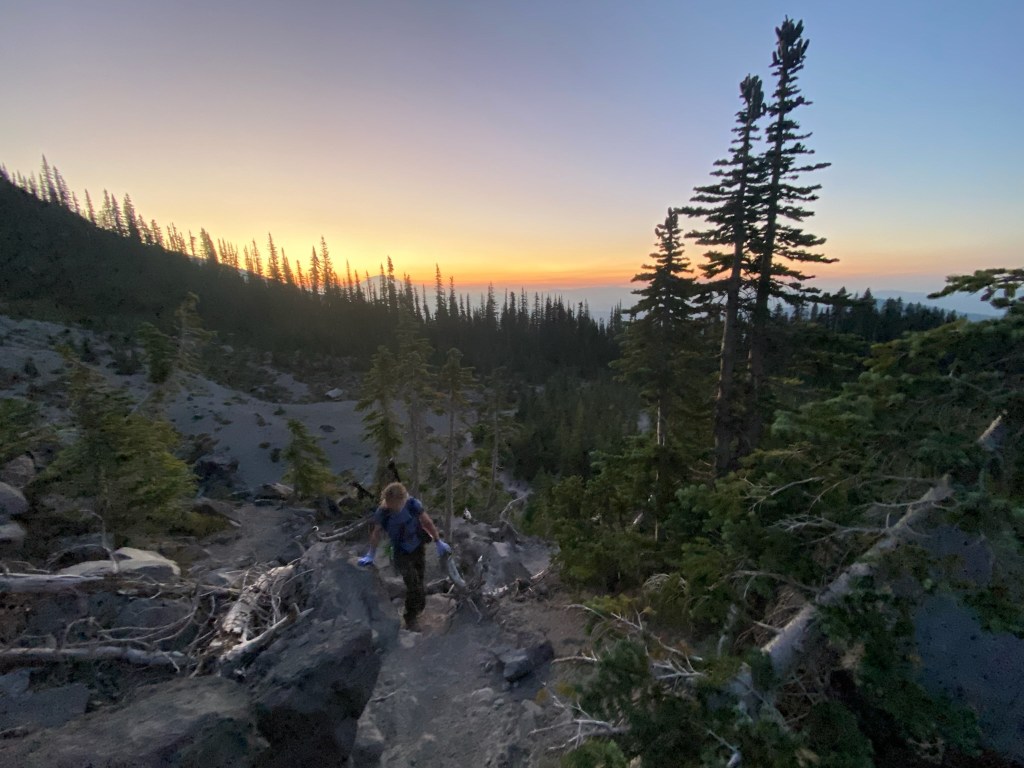 With our headlamps, everything still appeared to be lightly dusted with ash, even after all these years. It’s likely from ash kicked up by hikers, but the visual was striking. Half way into the forest portion there was a ruckus in the trees. A large animal, or maybe a Sasquatch, leaving the area abruptly to avoid detection. We made sure to talk more to let whatever it was know were were people, and we didn’t want any trouble. At about 2/3 of the way through the gradually rising forest portion the sky began to glow with the rising sun, and a fire orange sunrise began to glow through the trees.