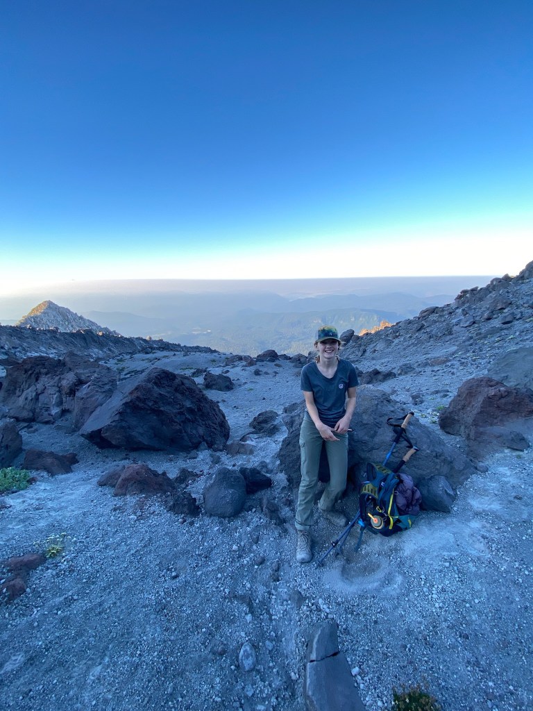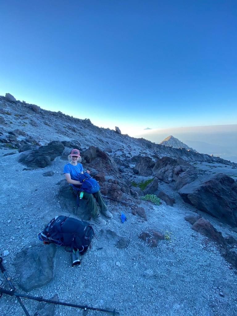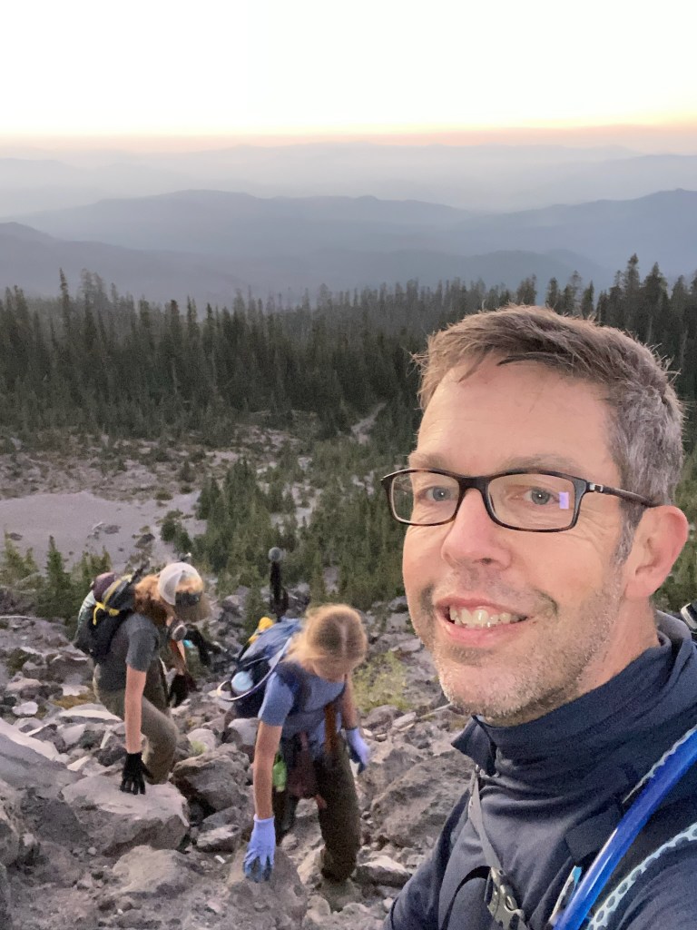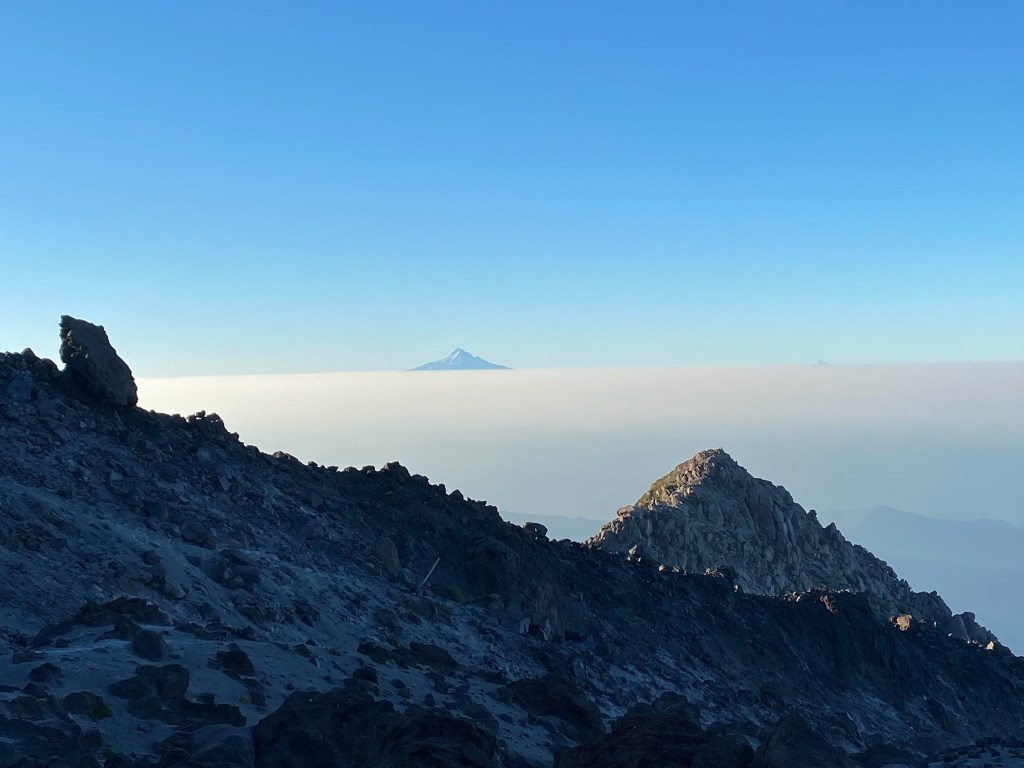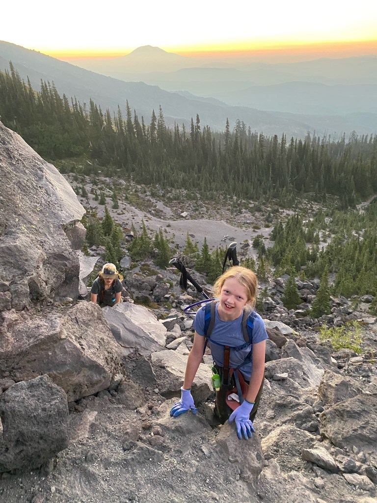 Through the boulder field you spend a significant portion of time scrambling on all fours over large volcanic rocks. I felt like we were on a road trip as the girls began asking “how much farther” at regular intervals. The summit was not in view yet, obscured by ridge after ridge of rocks to navigate. We encountered the 1 AM crew, and while I considered thanking them for the early morning wake up, decided instead to ask them how it was. They were giddy after having watched the sunrise and eaten breakfast from the summit. They were equally glad to be heading back down, as we would be hours later. We paused to watch the sun rise over a spur, and enjoyed the beauty of Mt Adams (I think) in the background.