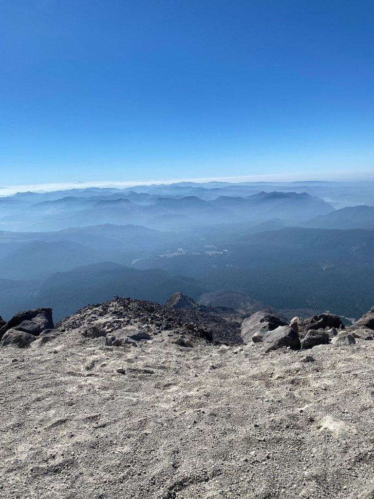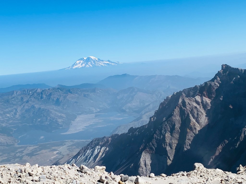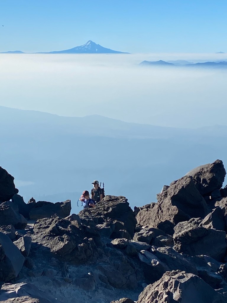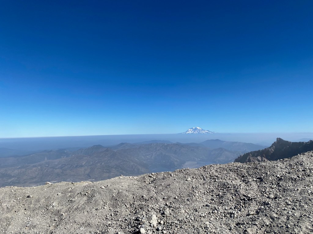 The view from the summit was amazing. A steep drop leads into the crater, with Rainier in the backdrop. A family from Bend offered to take our picture. I told them we were heading to Bend soon and they recommended that we climb South Sister. “It’s just like this, only longer.” I thought “maybe someday, but I’m gonna need a minute.” Reviews of south sister on All Trails suggest “this is the perfect trail to bring someone you hate.” Maybe someday. The noise from occasional rock slides into the crater were regular, and unnerving. I hoped our ridge wouldn’t crumble next. On this blue bell day, we were surrounded with views of Rainier, Adams, Baker, and Hood. What an amazing and volatile part of the world we live in.