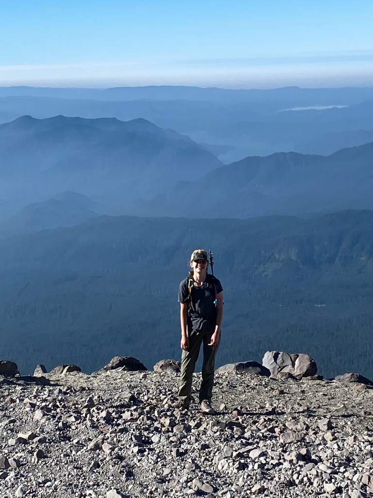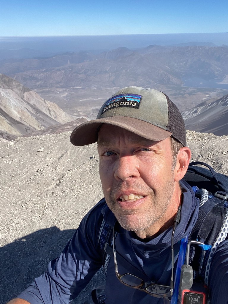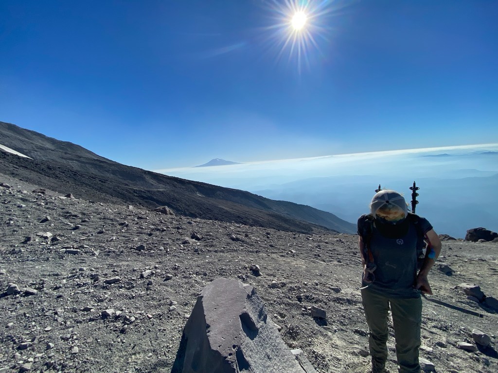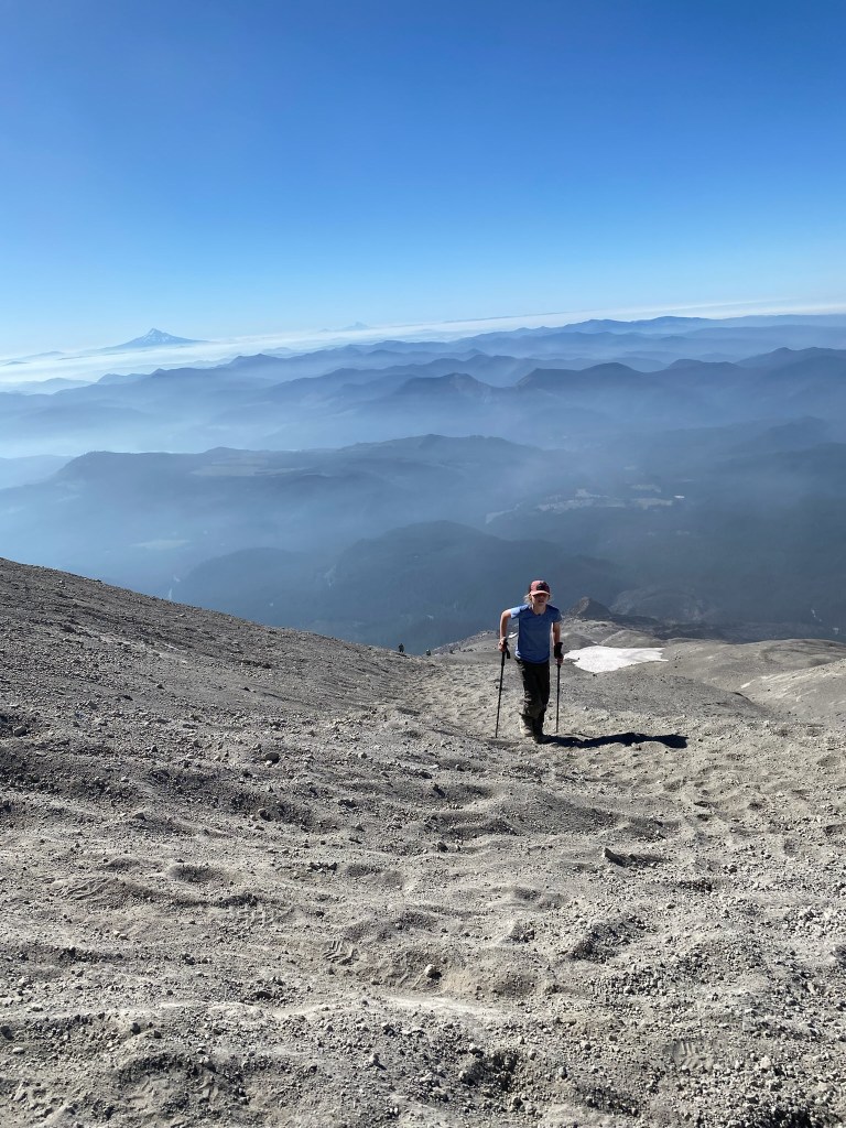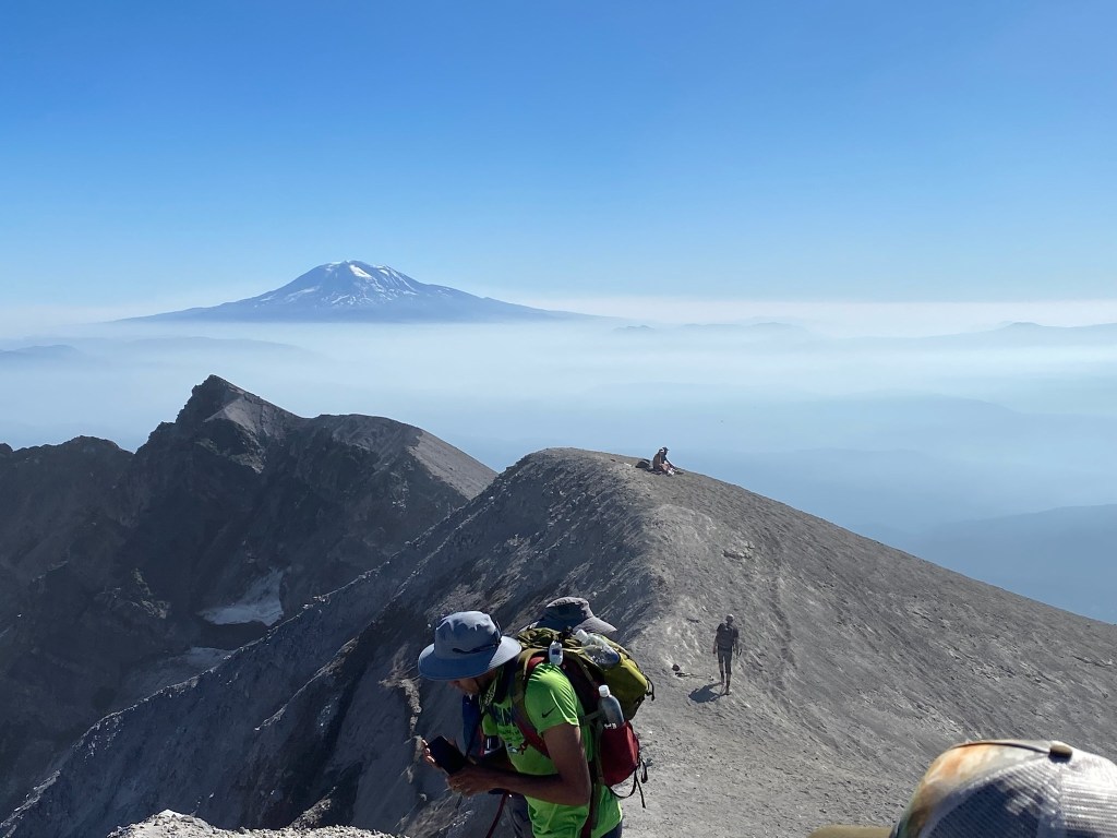 The view from the summit was amazing. A steep drop leads into the crater, with Rainier in the backdrop. A family from Bend offered to take our picture. I told them we were heading to Bend soon and they recommended that we climb South Sister. “It’s just like this, only longer.” I thought “maybe someday, but I’m gonna need a minute.” Reviews of south sister on All Trails suggest “this is the perfect trail to bring someone you hate.” Maybe someday. The noise from occasional rock slides into the crater were regular, and unnerving. I hoped our ridge wouldn’t crumble next. On this blue bell day, we were surrounded with views of Rainier, Adams, Baker, and Hood. What an amazing and volatile part of the world we live in.