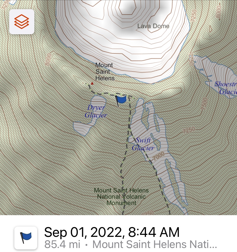 After what seemed like an eternity in full hot sun exposure, we walked through ash and scree on mini switchbacks, hoping to find footholds where someone else stepped not too long before. Washington States newest glaciers were on both sides of the spur (Monitor Ridge) we were climbing up: Swift Glacier to the right and Dryer Glacier to the left.